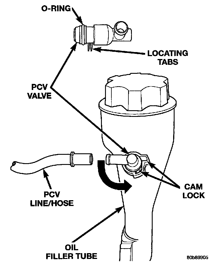 - a PCV valve mounted to the oil filler housing. The PCV valve is sealed to the oil filler housing with an O-ring.