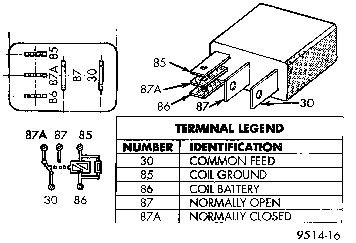 2. The relay normally closed terminal (87A) is connected to terminal 30 in the de-energized position, but is not used for this application. Go to Step 3.