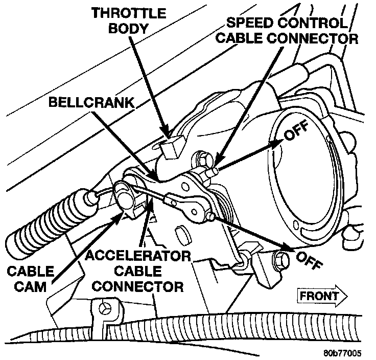 6. Using finger pressure only, disconnect speed control cable connector at throttle body bellcrank pin by pushing connector off bellcrank pin towards front of vehicle. DO NOT try to pull connector off perpendicular to the bellcrank pin. Connector will be broken.