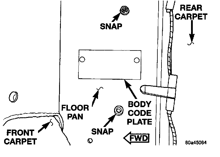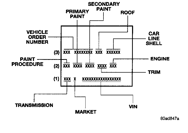 A metal body code plate is attached to the floor pan under the drivers seat. Disengage the snaps attaching the carpet to the floor pan to read the information. There are seven lines of information on the body code plate. Lines 4, 5, 6, and 7 are not used to define service information. Information reads from left to right, starting with line 3 in the center of the plate to line 1 at the bottom of the plate.