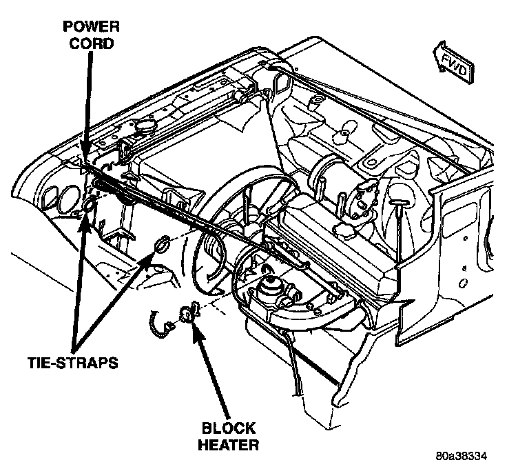 (5) Plug power cord into block heater. Route cord away from moving parts, linkages and exhaust system components. Secure cord in place with tie-straps.