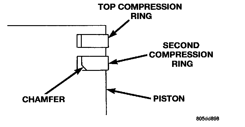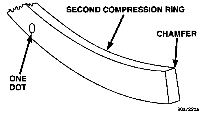7. The second compression ring has a slight chamfer on the bottom of the inside edge and a dot on the top for correct installation.