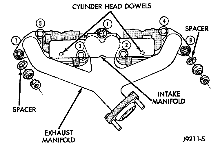 15. Remove bolts 2 through ~ securing the intake manifold to the cylinder head. LOOSEN BUT DO NOT REMOVE exhaust manifold bolt No. 1 and nuts 6 and 7.