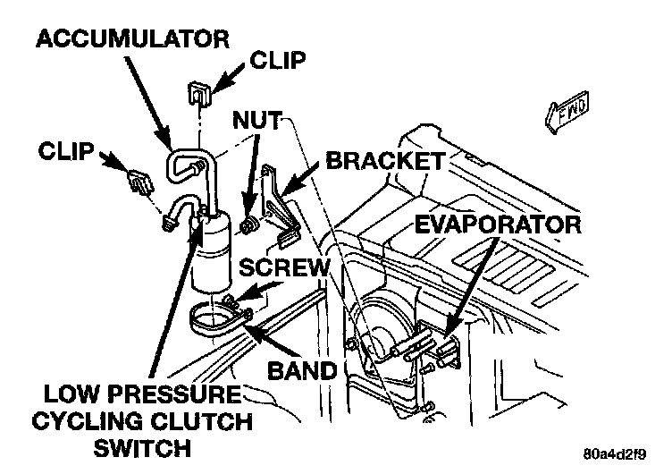 4. Remove the plastic clip that secures the liquid line to the accumulator outlet tube near the dash panel.