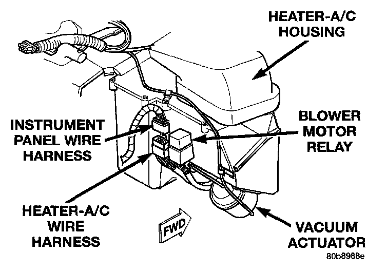 3. Locate the blower motor relay through the instrument panel glove box opening. The relay is mounted upright and to the right of the instrument panel harness.