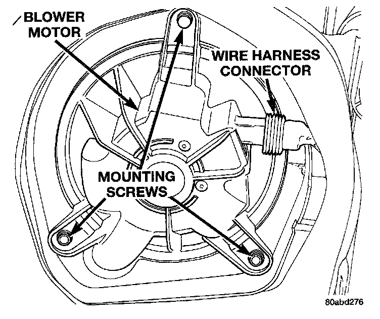 2. Install and tighten the three screws that secure the blower motor and wheel assembly to the heater- A/C housing. Tighten the mounting screws to 2.2 Nm (20 in. lbs.).