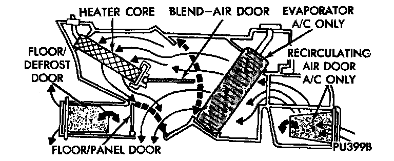 The heater and optional air conditioner are blend- air type systems. In a blend-air system, a blend-air door controls the amount of unconditioned air (or cooled air from the evaporator on models with air conditioning) that is allowed to flow through, or around, the heater core. A temperature control knob on the heater-A/C control panel determines the discharge air temperature by actuating an electric motor, which operates the blend-air door. This allows an almost immediate control of the output air temperature of the system.