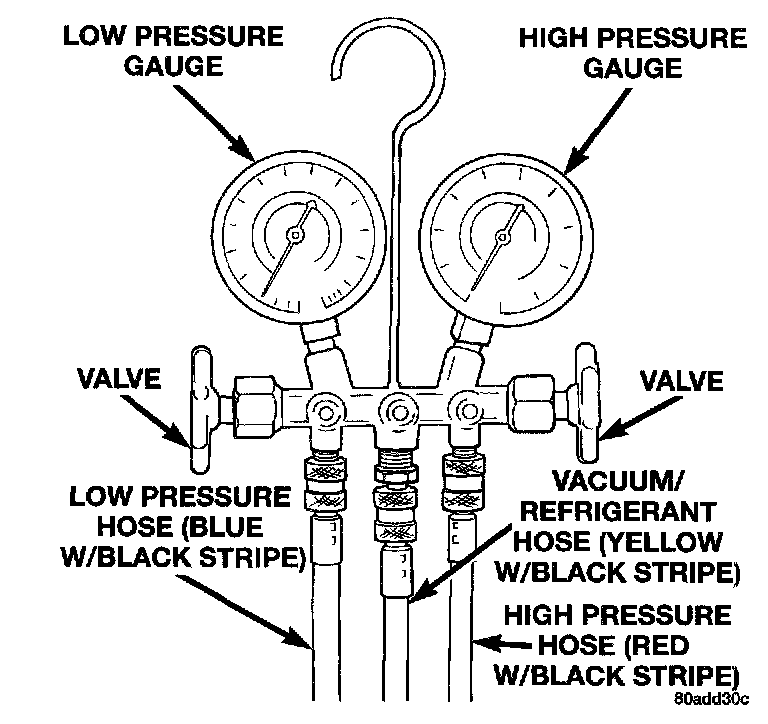 A manifold gauge set may be needed with some recovery/recycling/charging equipment. The service hoses on the gauge set being used should have manual (turn wheel), or automatic back-flow valves at the service port connector ends. This will prevent refrigerant from being released into the atmosphere.