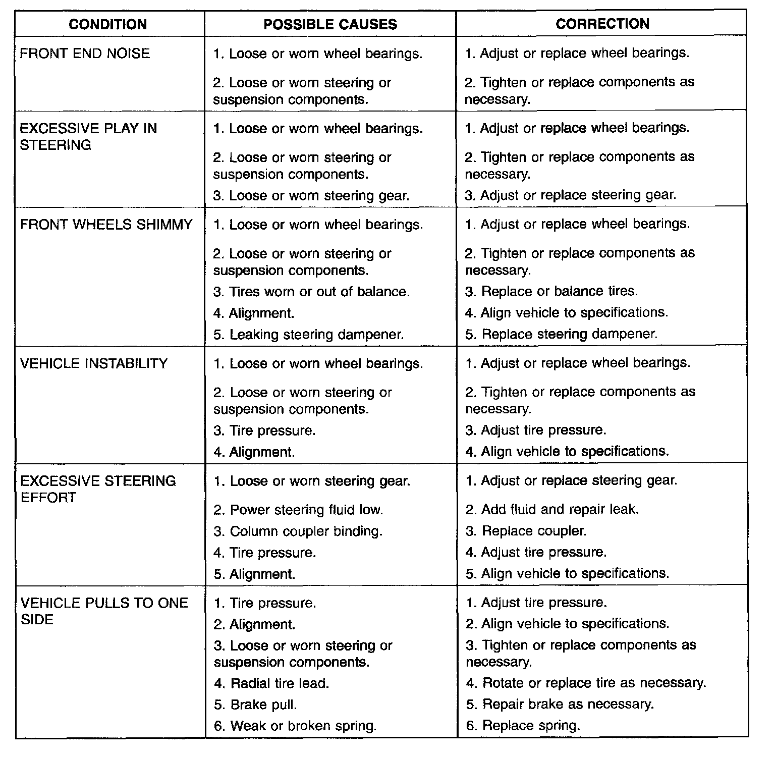Before starting wheel alignment, the following inspection and necessary corrections must be completed. Refer to Suspension and Steering System Diagnosis Chart, above for additional information.