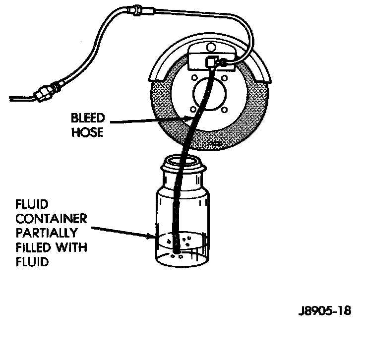 3. Attach one end of bleed hose to bleed screw and insert opposite end in glass container partially filled with brake fluid. Be sure end of bleed hose is immersed in fluid.