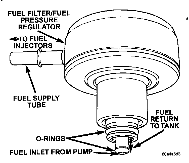 Fuel is supplied to the filter/regulator by the electric fuel pump through an opening tube at the bottom of filter/regulator.