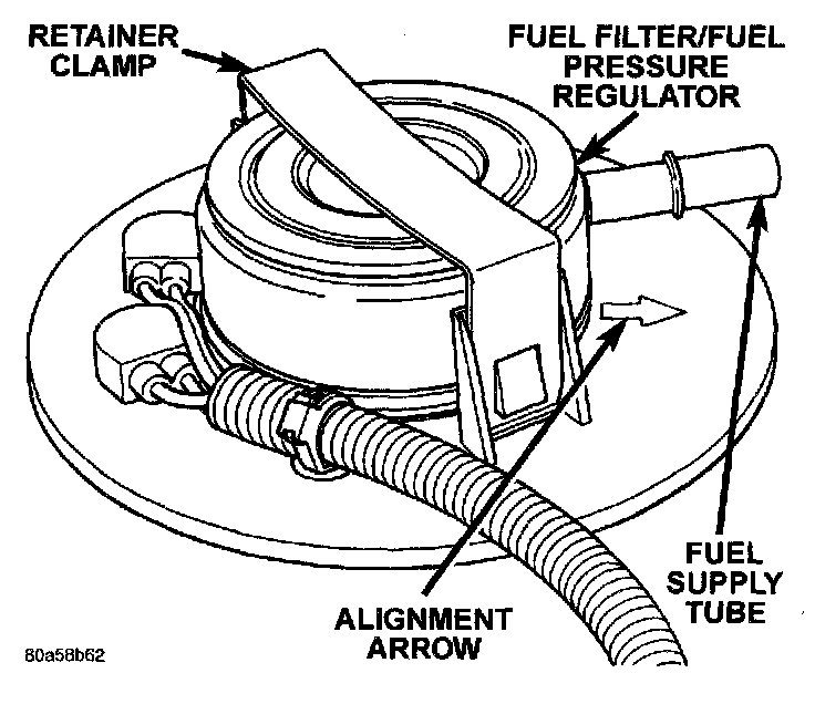 4. Remove retainer clamp from top of filter/regulator. Clamp snaps to tabs on pump module. Discard old clamp.