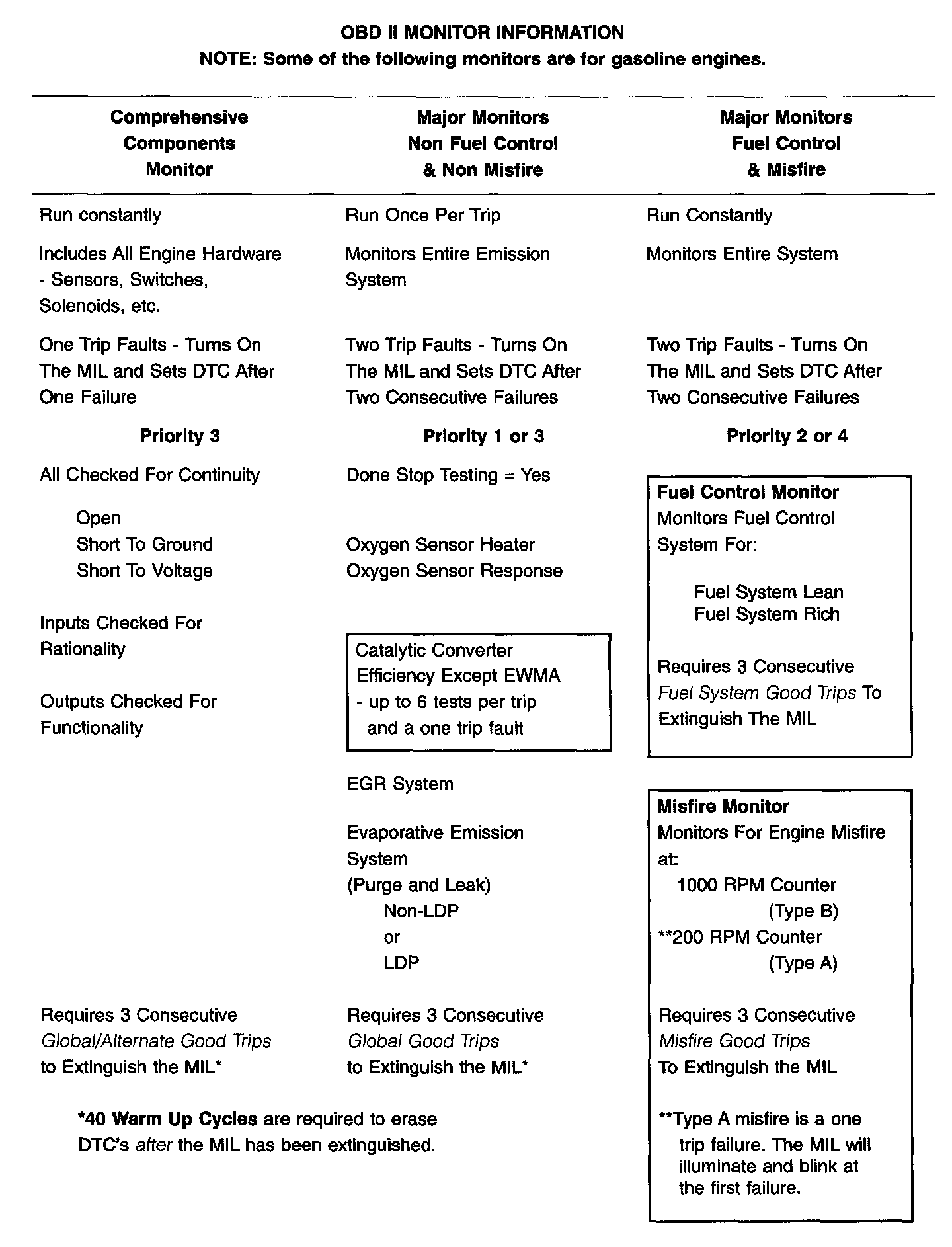 The table above summarizes the various OBDII monitors operation.