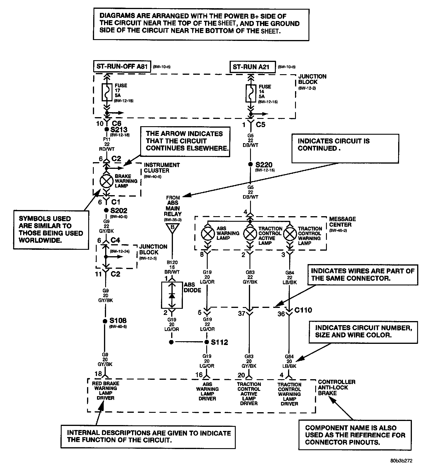 Diagrams are arranged such that the power (B+) side of the circuit is placed near the top of the page, and the ground (B-) side of the circuit is placed near the bottom of the page.