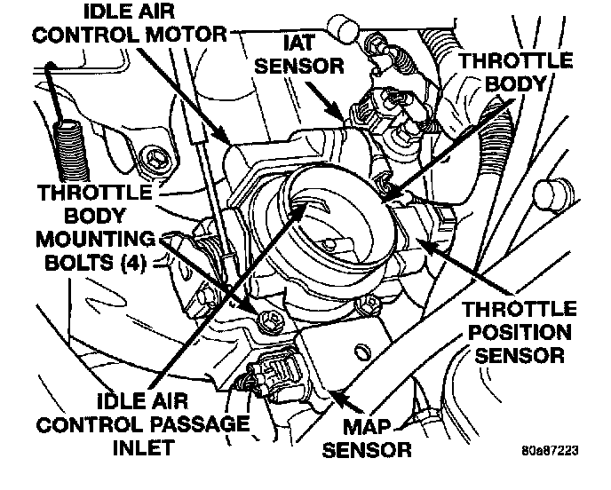 Idle Air Control Motor, IAT Sensor, Throttle Body, Throttle Position Sensor, MAP Sensor, Idle Air Control Passage Inlet, Throttle Body Mounting Bolts (4):