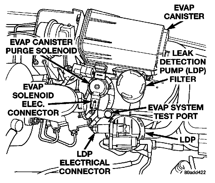 The LDP is located in the engine compartment near the EVAP canister. The LDP filter is also located near the EVAP canister. The LDP and LDP filter are replaced (serviced) as one unit