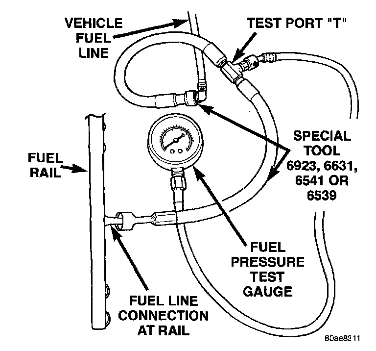 12. Testing for fuel injector or fuel rail leakage: Clamp off the rubber hose portion of Adaptor Tool between the fuel rail and the test port "T" on Adapter Tool. If pressure now holds at or above 30 psi, a fuel injector or the fuel rail is leaking.