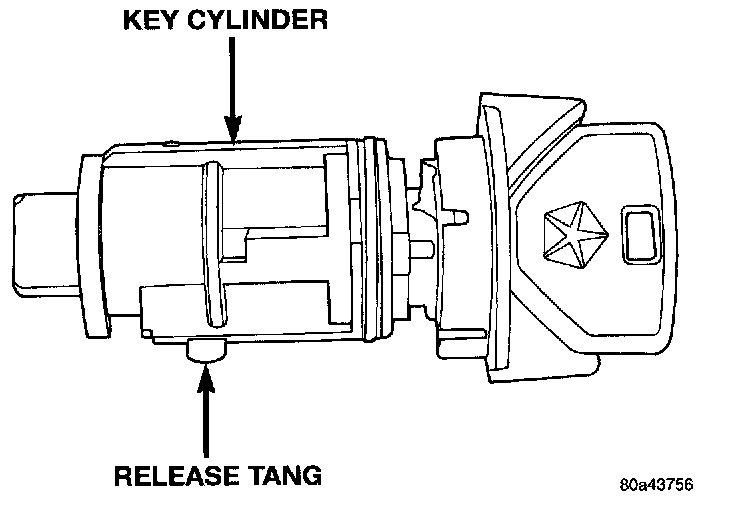The ignition key must be in the key cylinder for cylinder removal. The key cylinder must be removed first before removing ignition switch.CYLINDER REMOVAL