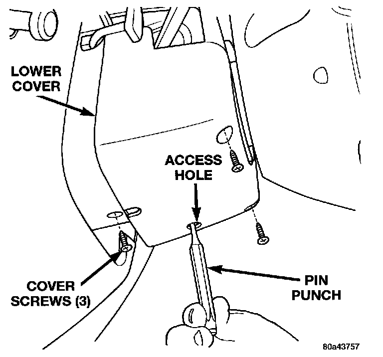 5. Position a small screwdriver or pin punch into tang access hole on bottom of steering column lower cover.
