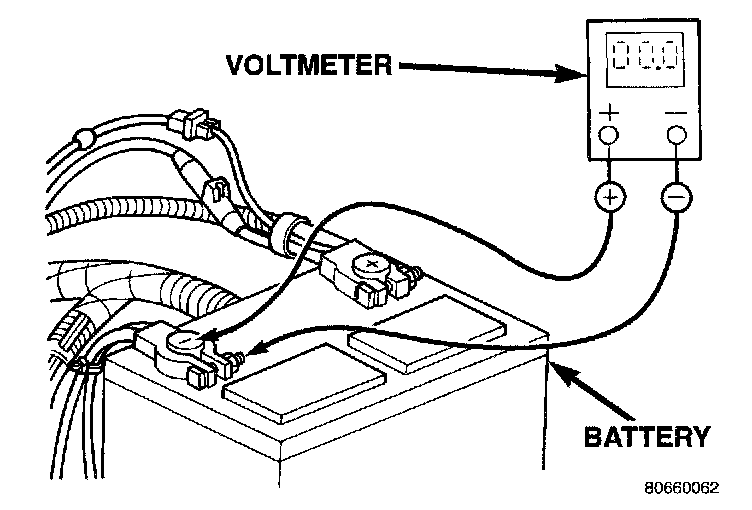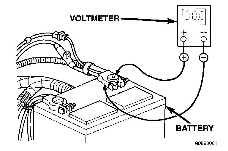 2. Connect the positive lead of the voltmeter to the battery positive terminal post. Connect the negative lead of the voltmeter to the battery positive cable clamp. Rotate and hold the ignition switch in the Start position. Observe the voltmeter. If voltage is detected, correct the poor contact between the cable clamp and the terminal post.