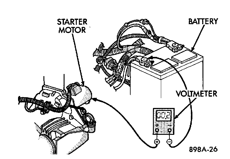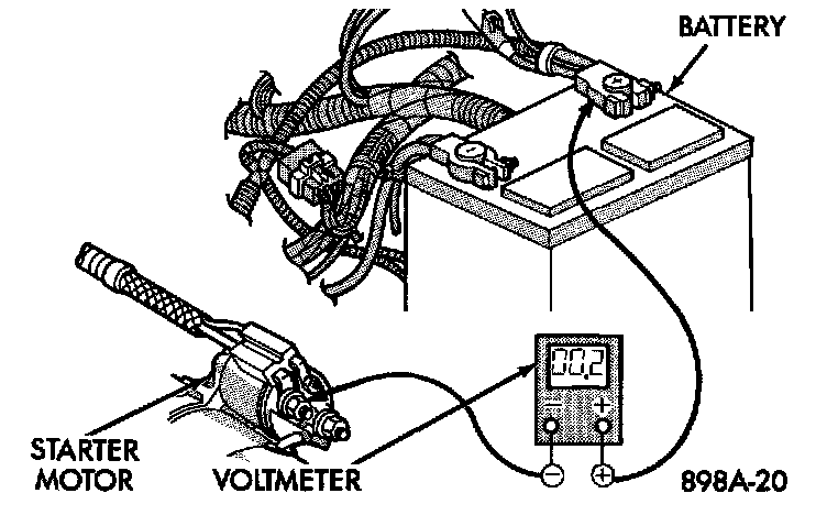 1. Connect the positive lead of the voltmeter to the battery negative terminal post. Connect the negative lead of the voltmeter to the battery negative cable clamp. Rotate and hold the ignition switch in the Start position. Observe the voltmeter. If voltage is detected, correct the poor contact between the cable clamp and the terminal post.
