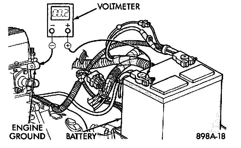 4. Connect the voltmeter to measure between the battery negative terminal post and a good clean ground on the engine block. Rotate and hold the ignition switch in the Start position. Observe the voltmeter. If the reading is above 0.2 volt, clean and tighten the battery negative cable attachment on the engine block. Repeat the test. If the reading is still above 0.2 volt, replace the faulty battery negative cable.