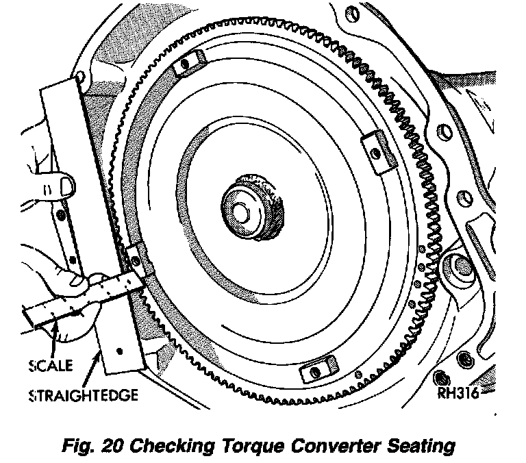 6. Check converter seating with a scale and straightedge (Fig. 20). Surface of converter lugs should be 1/2 inch to rear of straightedge when converter is fully seated.