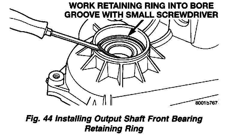 5. Install output shaft front bearing retaining ring. Start ring into place by hand. Then use small screwdriver to work ring into case groove. Be sure ring is fully seated before proceeding.