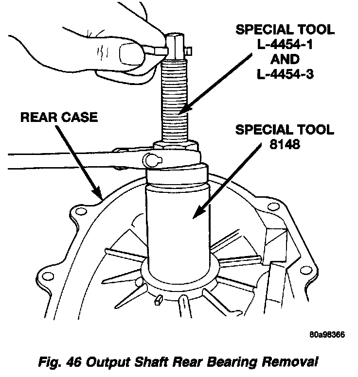 7. Remove the output shaft rear bearing with the screw and jaws from Remover L-4454 and Cup 8148.