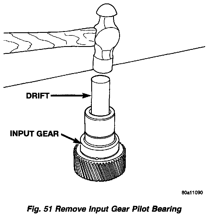 13. Remove input gear pilot bearing by inserting a suitably sized drift into the splined end of the input gear and driving the bearing out with the drift and a hammer.