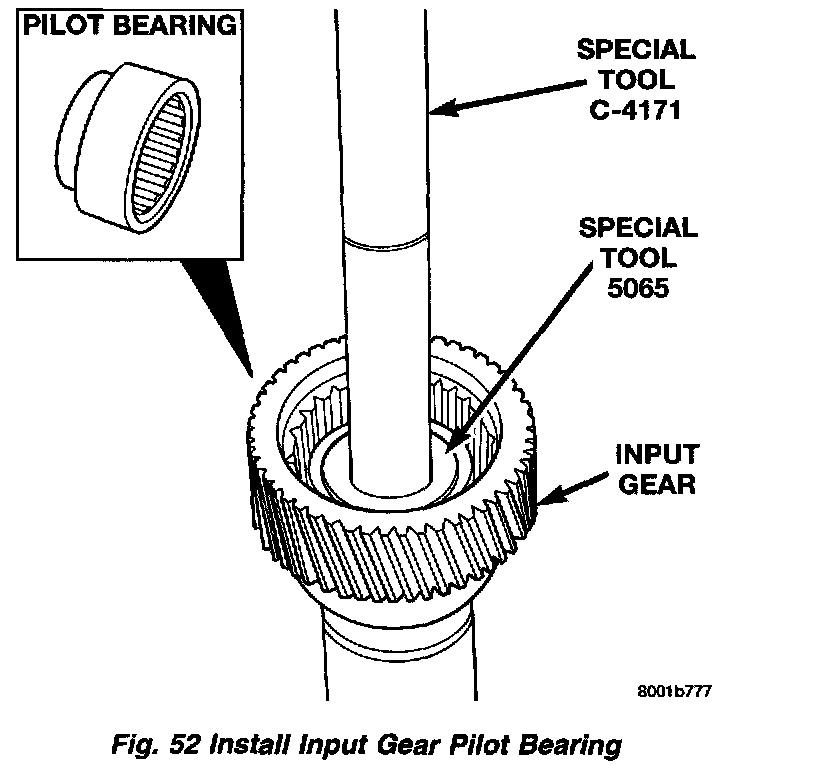 8. Install new bearing with Tool Handle C-4171 and Installer 5066. The bearing bore is chamfered at the top. Install the bearing so it is flush with the lower edge of this chamfer.