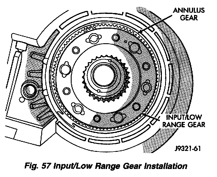 1. Align and install low range/input gear assembly in front case. Be sure low range gear pinions are engaged in annulus gear and that input gear shaft is fully seated in front bearing.