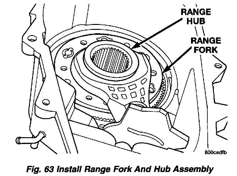 4. Assemble and install range fork and hub. Be sure hub is properly seated in low range gear and engaged to the input gear.