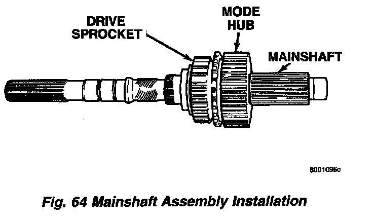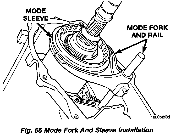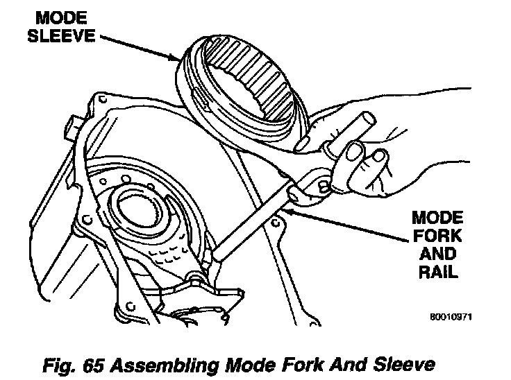 9. Install assembled mode fork and sleeve. Be sure fork rail goes through range fork and into case bore. Also be sure sleeve is aligned and seated on mainshaft hub.