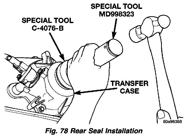 6. Slide Installer C-4076-B onto seal protector with the recessed side of the tool toward the seal. Drive seal into rear bearing retainer with installer C-4076-B and handle MD-998323.