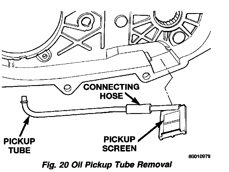 12. Disengage oil pickup tube from oil pump and remove oil pump assembly. Remove oil pump by tilting the edge of the oil pump from under the edge of the rear case half and sliding the pump.