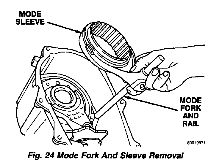 3. Remove mode fork and sleeve as an assembly. Note position of sleeve for assembly reference. The short side of the sleeve faces upward.
