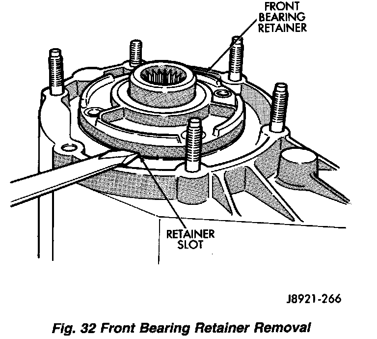 2. Remove front bearing retainer. Pry retainer loose with pry tool positioned in slots at each end of retainer.