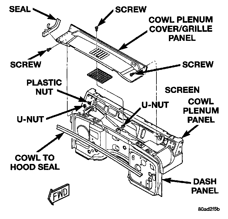 4. Remove the four screws that secure the cowl plenum cover/grille panel to the cowl panel near the base of the windshield.