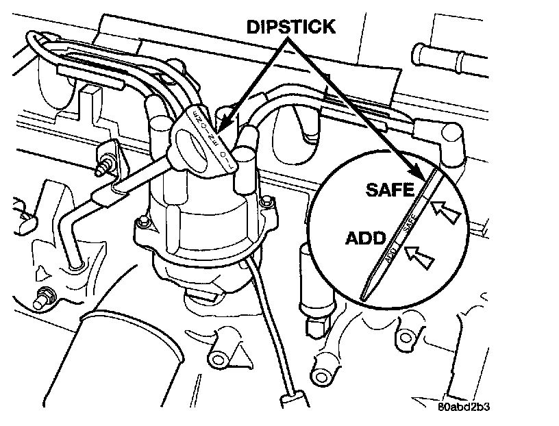 5. Remove dipstick, with handle held above the tip, note oil level reading.