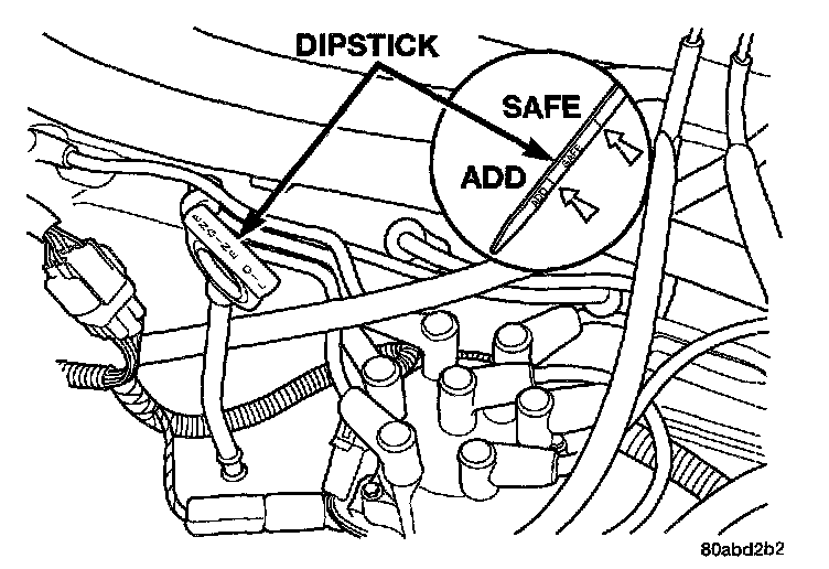 To ensure proper lubrication of an engine, the engine oil must be maintained at an acceptable level. The acceptable levels are indicated between the ADD and SAFE marks on the engine oil dipstick.