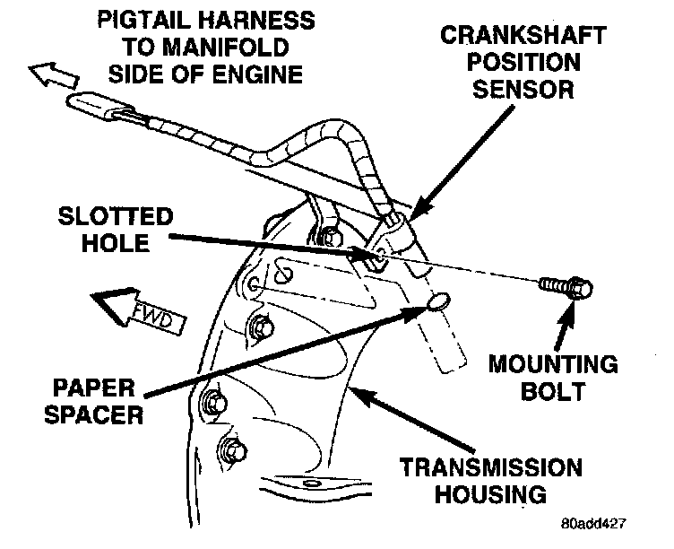 The crankshaft position sensor is mounted to the transmission bellhousing at the left/rear side of the engine block.