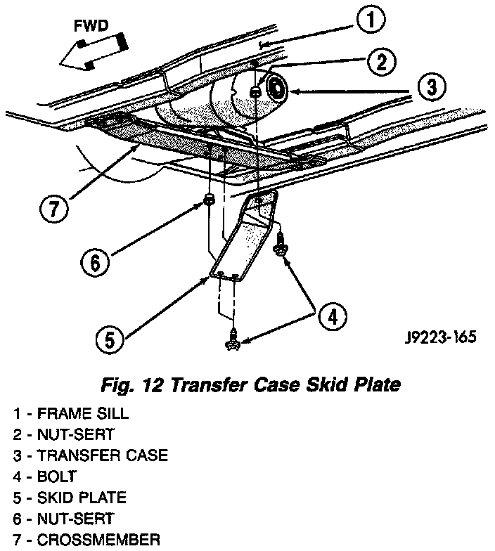 2. Remove bolts that attach skid plate to transmission support crossmember and frame sill (Fig.12).
