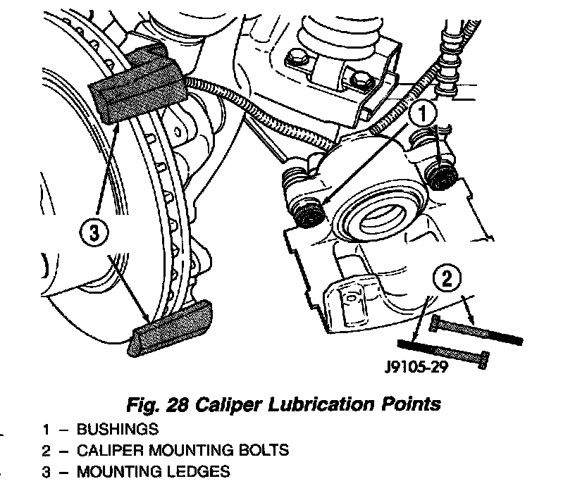 1. Clean brake pad mounting ledges with wire brush and apply light coat of Mopar multi-mileage grease to surfaces.