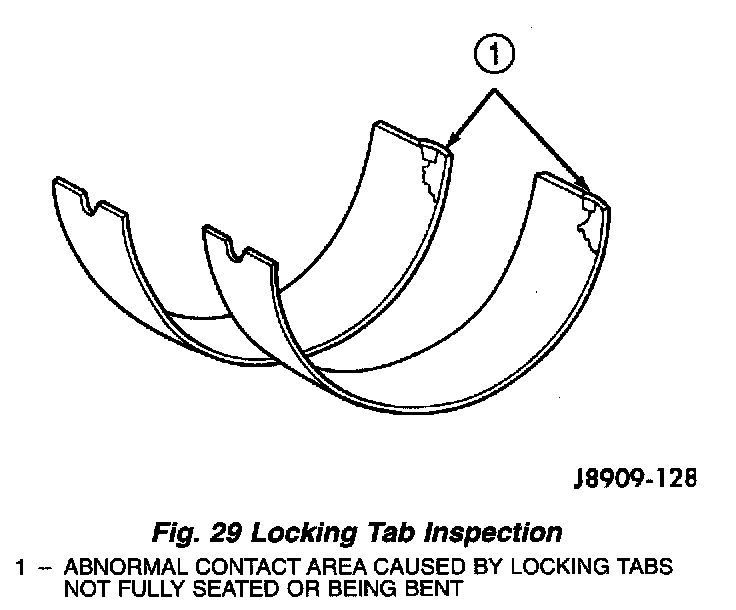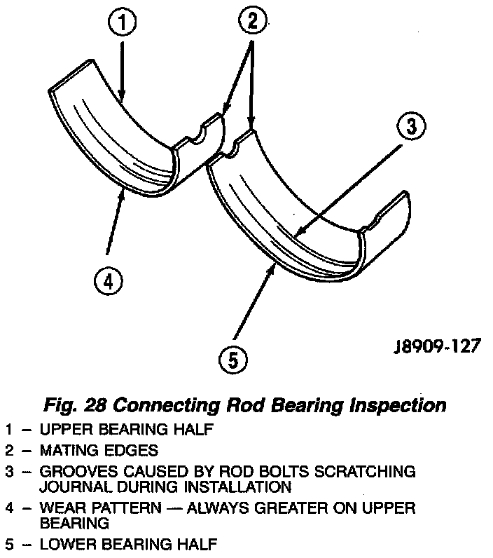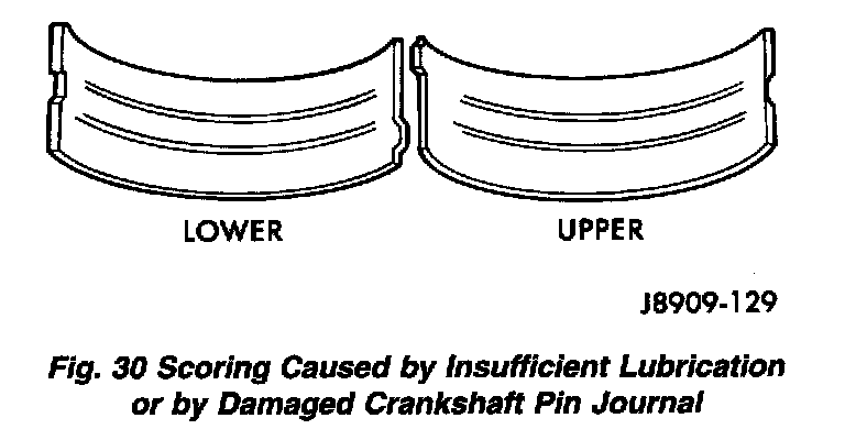 Inspect the connecting rod bearings for scoring and bent alignment tabs (Fig. 28) (Fig. 29). Check the bearings for normal wear patterns, scoring, grooving, fatigue and pitting (Fig. 30). Replace any bearing that shows abnormal wear.