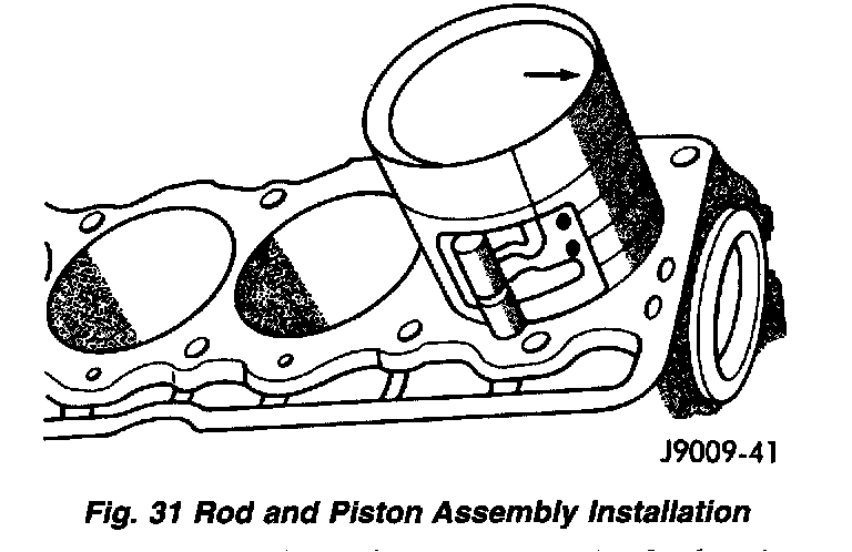 4. Use piston ring compressor to install the rod and piston assemblies. The oil squirt holes in the rods must face the camshaft. The arrow on the piston crown should point to the front of the engine (Fig 31). Verify that the oil squirt holes in the rods face the camshaft and that the arrows on the pistons face the front of the engine.
