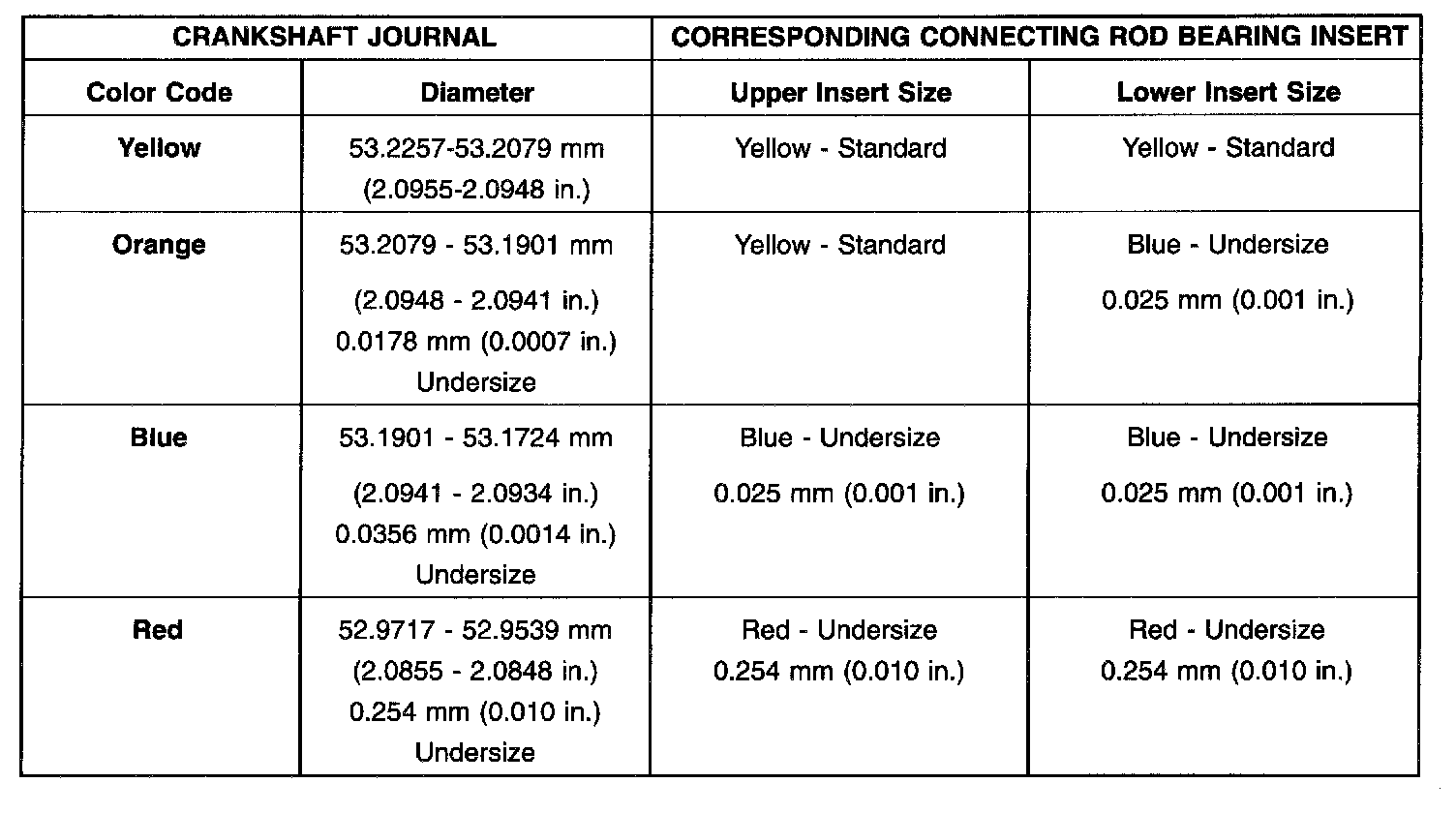 11. FOR EXAMPLE: If the initial clearance was 0.0762 mm (0.003 inch), 0.025 mm (0.001 inch) undersized inserts would reduce the clearance by 0.025 mm (0.001 inch). The clearance would be 0.002 inch and within specification. A 0.051 mm (0.002 inch) undersized insert would reduce the initial clearance an additional 0.013 mm (0.0005 inch). The clearance would then be 0.038 mm (0.0015 inch).