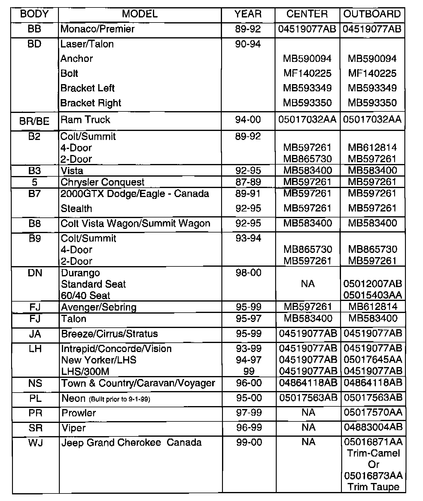 THIS BULLETIN IS PROVIDED TO IDENTIFY THE PARTS AND LABOR OPERATION NUMBERS NECESSARY TO INSTALL A CHILD SEAT TETHER ANCHOR. DAIMLERCHRYSLER WILL REIMBURSE YOU FOR THE ANCHORS AND LABOR TO INSTALL THEM. THIS IS BEING DONE IN THE INTEREST OF CUSTOMER SATISFACTION. REFER TO GLOBAL WARRANTY ADMINISTRATION BULLETIN # D-99-23 FOR COMPLETE REIMBURSEMENT INSTRUCTIONS.