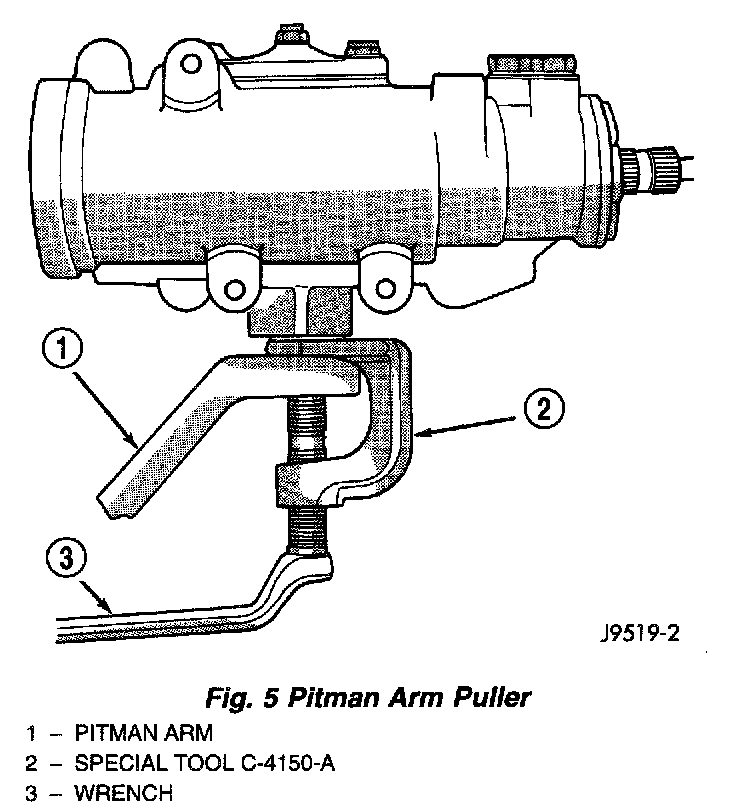 3. Remove the nut and washer from the steering gear shaft. Mark the pitman shaft and pitman arm for installation reference. Remove the pitman arm from steering gear with Puller C-4150-A.