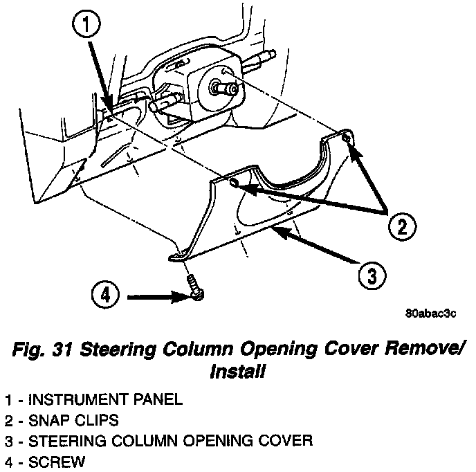 2. Align the snap clip retainers near the upper edge of the steering column opening cover with the receptacles in the instrument panel (Fig. 31).